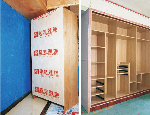墻面刷防潮涂料兩遍,檢查合格。對柜子與墻、地接粗部分刷好光油,貼上珍珠棉。包門套做防潮,門套下腳要先浸泡光油200mm高。雙面夾板墻,做雙面防潮。
