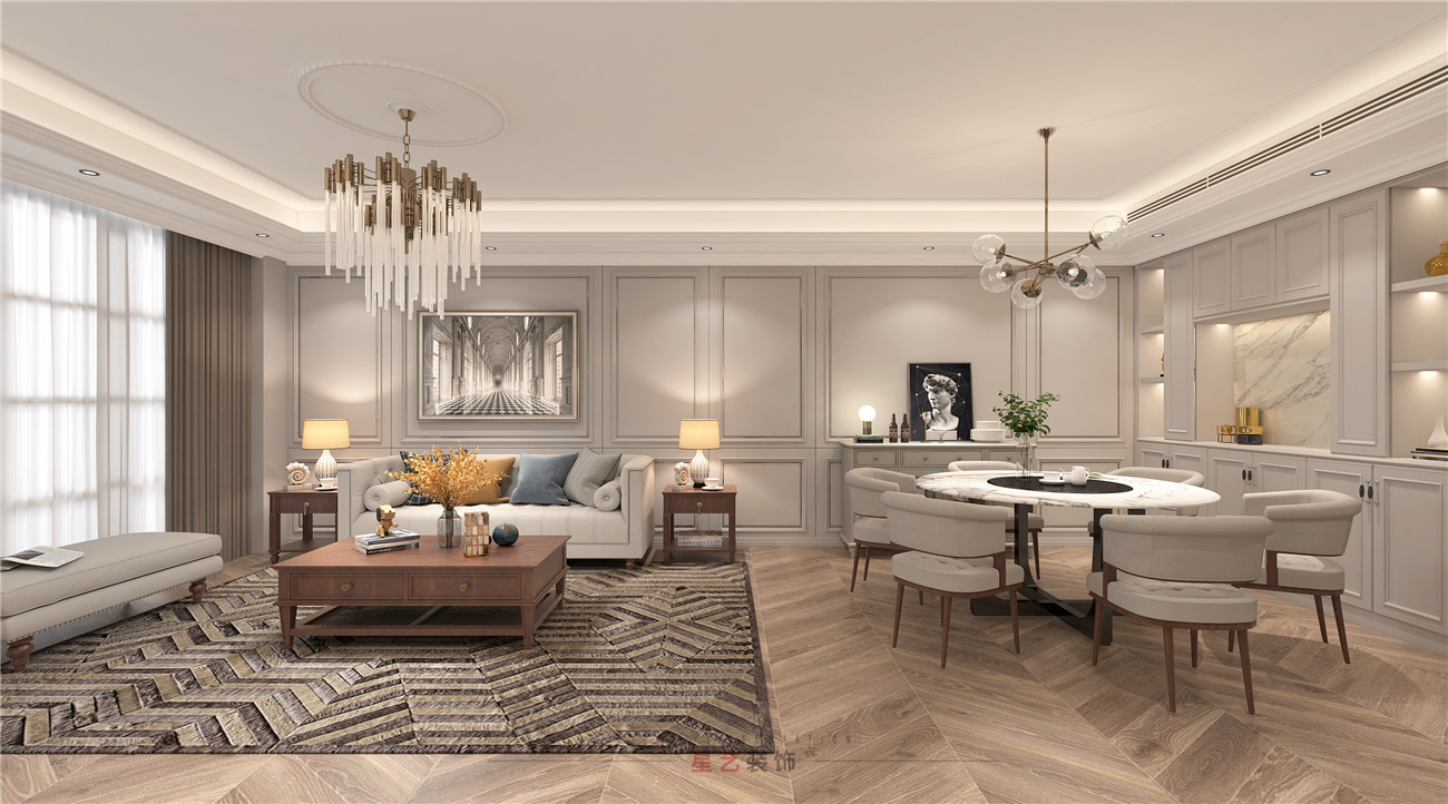 客廳作為主要的待客區,進了門就可以看到主要的休閑區和用餐區,因為整體空間上會比較低矮平和,所以在選材上也會偏向于舒適,柔軟,溫馨的材質組合,可以建立出溫馨的家庭氛圍,兩種的不同精致華麗得吊燈也為客廳和用餐區劃分出區域。