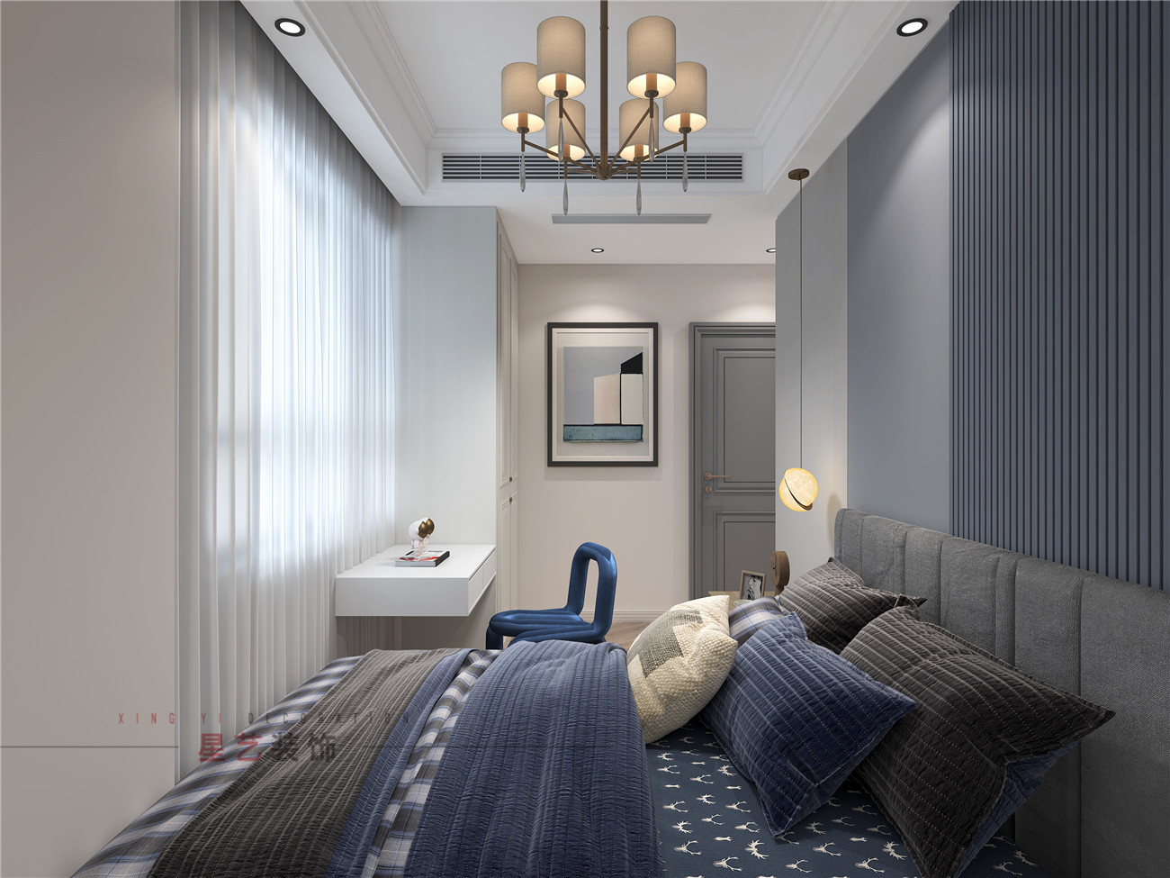 保姆房稍微小一些,但總體來說也是簡約舒適,主要采用藍灰色為主。房間有不同風格的美式吊燈,增加每個空間的奢華感,精致感,讓每個家庭成員都能在這樣溫暖舒適的環境中找到家的歸屬感。