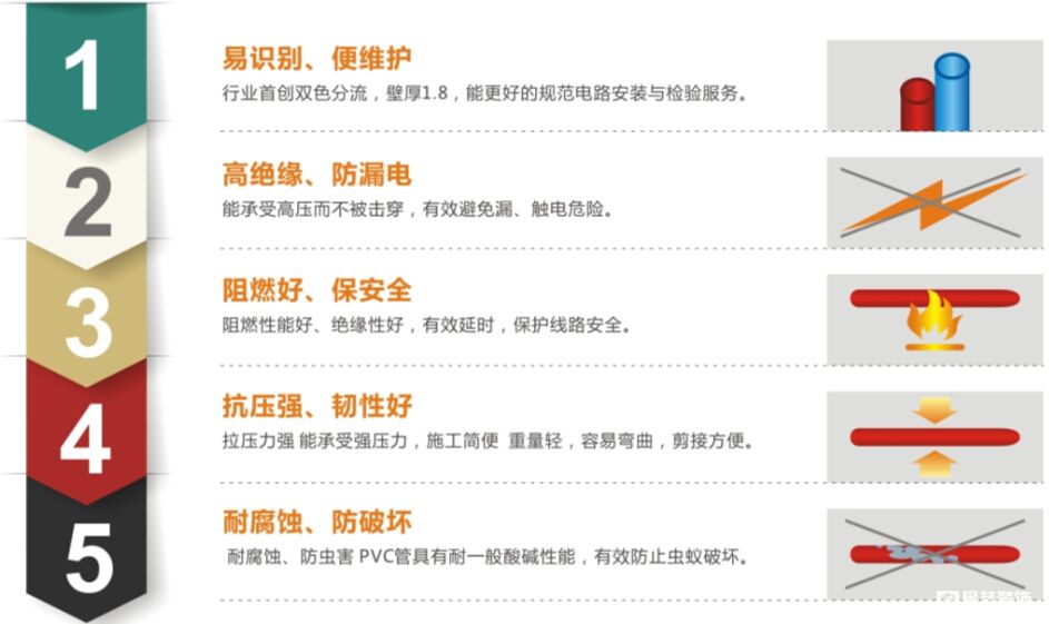 行業(yè)首創(chuàng)雙色電工套管,根據(jù)星藝裝飾標準工藝的要求為了更好的規(guī)范電路工程,確保工程品質(zhì),及監(jiān)理與業(yè)主對電工項目的檢查與驗收,采用優(yōu)質(zhì)的阻燃型有色PVC塑料管作強、弱電線保護管材。紅色——強電及照明用電專用,藍色——弱電項目專用。